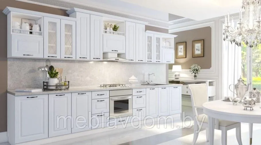 Большой выбор модулей: различные конфигурации, размеры и назначение (навесные шкафы, рабочие столы, пеналы, модули под встраиваемую технику) позволяют создать кухню, которая впишется именно в ваше помещение с точностью до сантиметра.